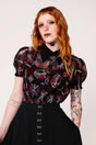 From a kingdom long forgotten, The Clarimond Blouse emerges. This semi-fitted blouse features a black chiffon base, intricately illustrated with ornate armour and sword motifs. The pointed collar ignites power, whilst the puff sleeves and frill cuffs add a soft touch. Style with The Quinn Skirt pictured for an everyday look, or go even more fantastical with The Prudence Skirt.
