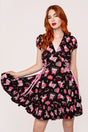 This playful viscose mini dress features a black base with vibrant pink and red artwork of hearts, bows, roses, and adorable animals. The V-neckline offers a flattering cut, while underbust seams offer added support and structure. The fitted bodice flares into a skirt for a flattering silhouette made for movement. Short puff sleeves are encapsulated in elasticated edges, and the pink corset-style waist ties offer an extra touch of detail.