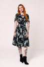Add a touch of venom to your wardrobe with The Serpent Dress. This mid-length, chiffon dress features a black base, brought to life with a print of white snakes emerging from blue and teal flowers. Flowy, draped sleeves add movement and flair, whilst the chest gathers into the underbust seam to meet the fitted bodice. The skirt flares from the waistline, creating drama with every step. Pair it with your favourite black boots for effortless styling, or dress it up with heels and chunky jewellery for a look to suit any occasion!