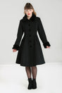 - Black fit-and-flare coat with faux fur collar and cuffs