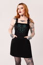 Turn heads in this bold black pinafore-style dress, entranced with a large teal snake embroidered on the bib. Crafted with adjustable wide straps and grungy buckle details, this pinafore dress provides comfort whilst remaining effortlessly sleek. The A-line mini length skirt is adorned with central pockets, perfect for all your on-the-go spells and trinkets. Made with a discreet zip fastening at the centre back for a smooth and seductive finish.