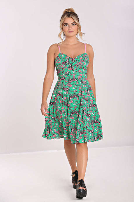 Knee-length dresses are back, and we can’t get enough of this quintessential feminine style! The iconic tea dress silhouette combines a fitted bodice with a flared skirt that sits above the knee. At Hell Bunny, we’ve put our own twist on the classic 50s knee-length dress with bold, alternative prints and shorter hemlines that are ideal for day or night-time wear.