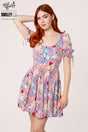 Part of Hell Bunny's collaboration with Smiley® Originals, The Loulou Dress! This cute mini dress features a square neckline at the front and back, dainty puffed sleeves with frilled elasticated cuffs and ties, and a fitted bodice that flows into a voluminous gathered skirt. This dress is made with a sweet pink base, intricately illustrated with Smiley® hearts, stars, planets and rainbows all over. Notice that the back includes adjustable ties for an adorable bow detail. Whether you’re dressing up or down, The Loulou Dress will certainly brighten your day!