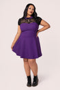 Haunt the occasion with The Batsy Dress. This deep purple, bengaline mini dress features intricate panels of black mesh on the chest and sleeves, with flocked velvet bats for a haunting detail. A keyhole detail at the centre of the chest is embellished with a dainty black bow. The chest is accentuated with a flattering sweetheart neckline as the fitted bodice shapes until the waistline, before flowing into a flared skirt that’s perfect for dancing the night away.