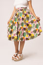 Take a trip to paradise with The Benita Skirt. This 50’s style skirt features a light brown cotton base, decorated with sunset tones and tropical foliage. The skirt is gathered from the waistband for added volume, with square wooden buttons that fasten at the side front placket, and pockets in the side seams for all your essentials. The Benita Skirt has everything you need for a fun season ahead.