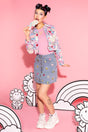 Part of Hell Bunny's collaboration with Smiley® Originals, The Lottie Skirt! This A-line, stretch denim mini skirt is a blue denim base, decorated with adorable Smiley® daisy and planet motif embroidery all over. The high-waisted skirt has metal buttons to fasten down the front, pockets at the front and back, and belt loops at the waistband for added fit and style. Wear with The Loulou Blouse as pictured for an adorable ensemble that’s bound to put a smile on your face!