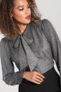 - Silver lurex semi-fitted blouse with large tie detailing at the neck for added glam