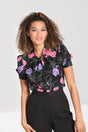- Black semi-fitted blouse decorated with pink & purple roses and spiderwebs