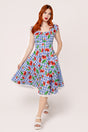 There’s nothing cuter than a picnic, besides The Picnic Dress of course. This 50’s style cotton dress features a large blue and white gingham print, with juicy red cherries scattered all over. The scooped neckline meets the centre keyhole, with a dainty white bow for a finishing touch. Elasticated short puff sleeves can be sat on or off the shoulder exactly how you like it. The fitted bodice flares from the waist seam into a full circle skirt, with pockets at the side seams, and elegant white scalloped trim at the hem for added detail. The skirt provides beautiful movement on it’s own, or style with one of our petticoats for even more vintage volume.