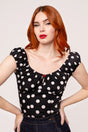 The Domino Top is a spot of vintage glamour, perfect for any occasion. This retro style fitted top, printed in black with large white polka dots, features elasticated sleeves that can be worn on or off the shoulder for versatile styling. The elasticated neck edge is enhanced with a keyhole front, embellished with a flirty red heart button. The underbust seam adds extra shape to the chest, making this top an elevated addition to your wardrobe.