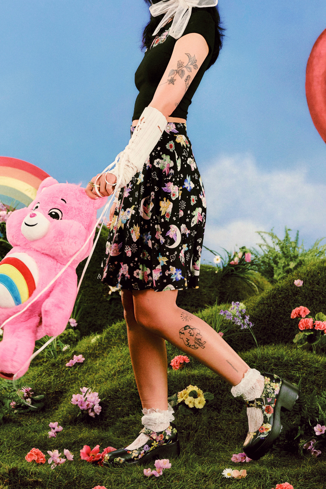 Part of Hell Bunny's collaboration with Care Bears, the Roxi Skirt! This printed mini skirt features a black base, illustrated with Grumpy Bear, Cheer Bear, and other beary besties amongst tattoo-inspired motifs. The decorative placket trails down the centre front, with pink contrasting piping and heart-shaped buttons for a cute touch. Style with the Cheer Bear Top pictured for a matchy look that’s perfect for Care-A-Lot!