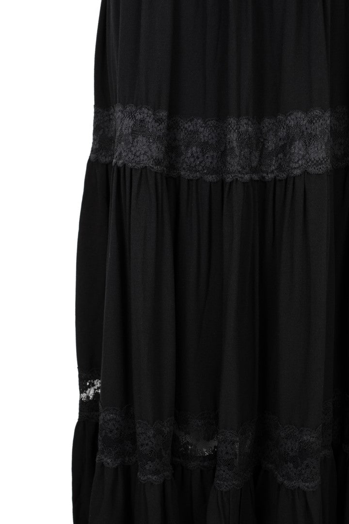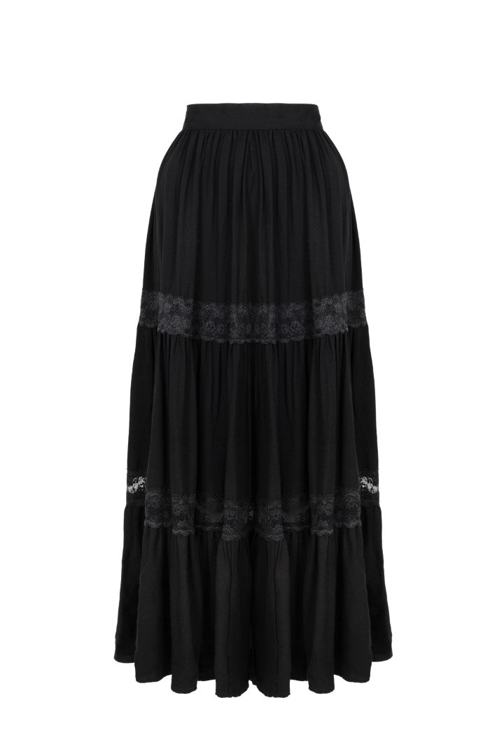 Mystify the night with The Nocturnal Skirt. This bold black, tiered midi skirt features voluminous gathers that flow from the waistband, meeting at two intricate lace panels for added drama. Style with a white top or bodysuit for a gothic, monochrome feel, or match with The Nocturnal Top for a full witchy look.