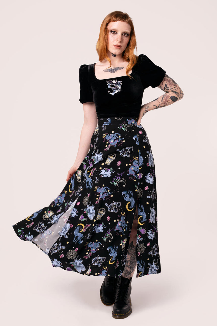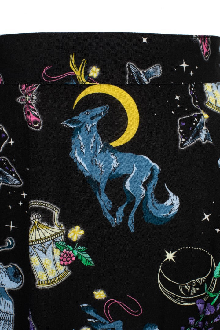 Embrace the night with The Moonlit Skirt. This skirt features a bold black base, decorated with enchanting woodland and celestial illustrations. The skirt flows from the waistband to create volume, with two flirty slits at the front, and discreet yet practical pockets in the side seams. Pair with our Moonlit Top for an ethereal ensemble!