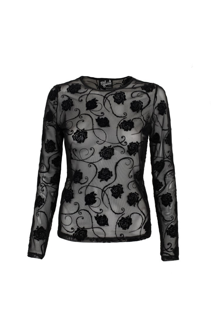 Alluringly dark, that’s The Florence Top. This bold black, stretch mesh top features velvet flocking of intricate roses and intertwining vines. Full-length sleeves offer coverage for those crisp, dark days. The top finished at the hips, perfect for tucking into jeans for ease, or layering under a pinafore for a preppy feel.