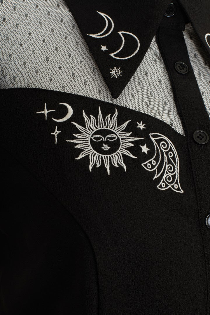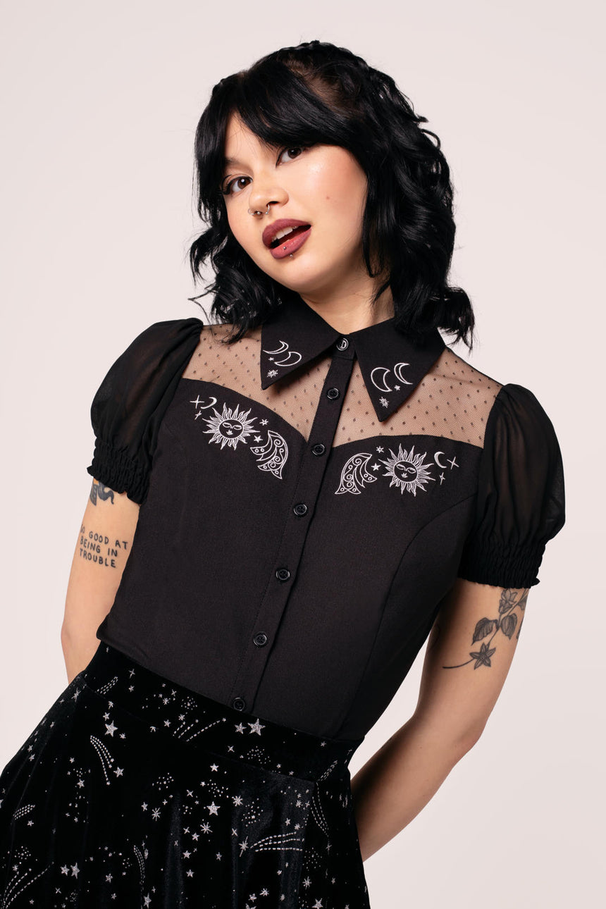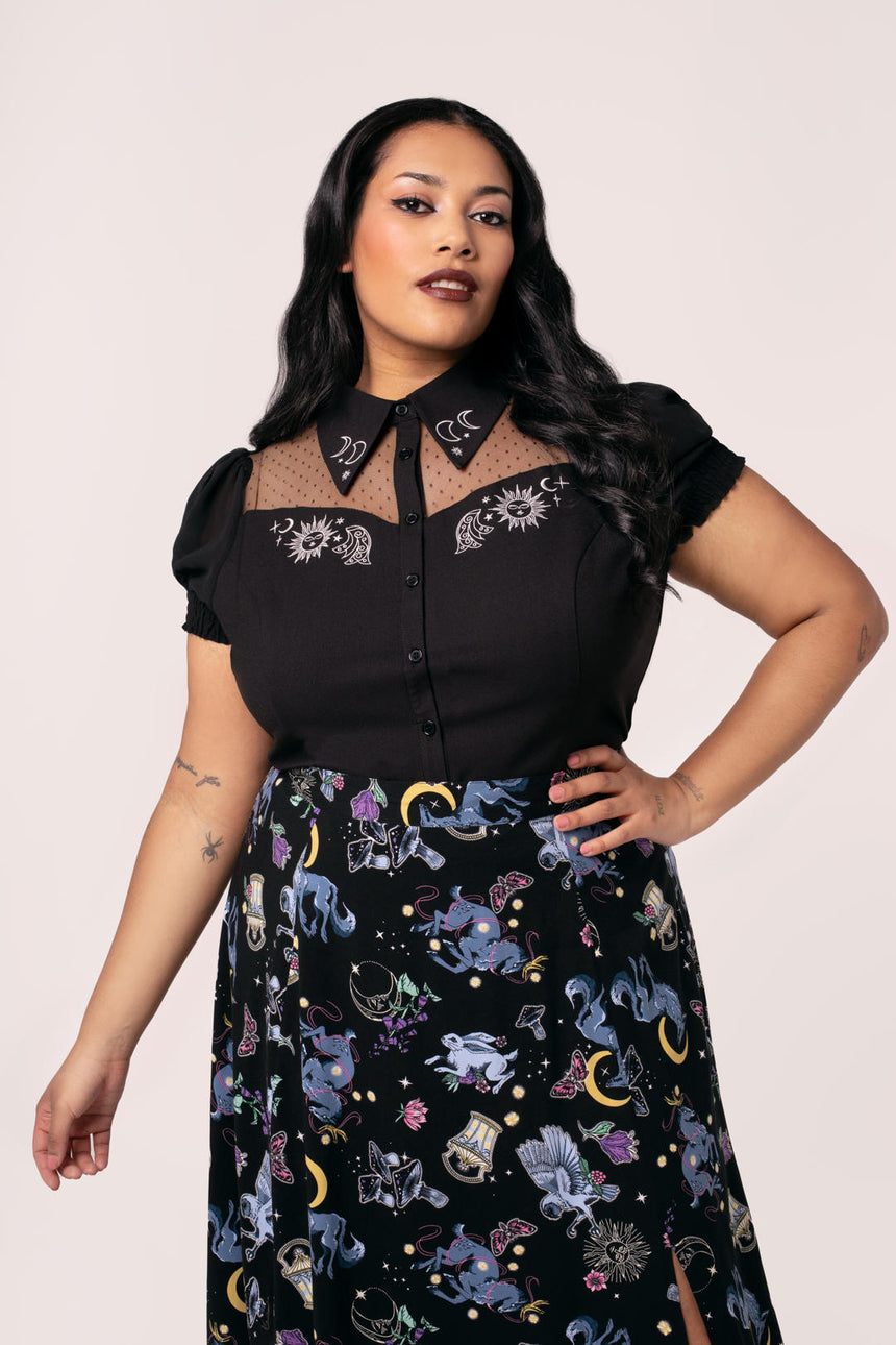Add some mystery to the everyday with The Danica Blouse. This semi-fitted, stretch polyester blouse features a pointed collar adorned with delicate white moon embroidery, a sheer black polka dot mesh cut-out at the chest, and intricate white sun and moon tarot-inspired embroidery across the front. The button-down front is finished with matching black buttons, whilst darts at the front and back offer a flattering shape. The elasticated sleeve cuffs provide added comfort, and the blouse falls to hip length for tucking in or leaving out for an easygoing feel.