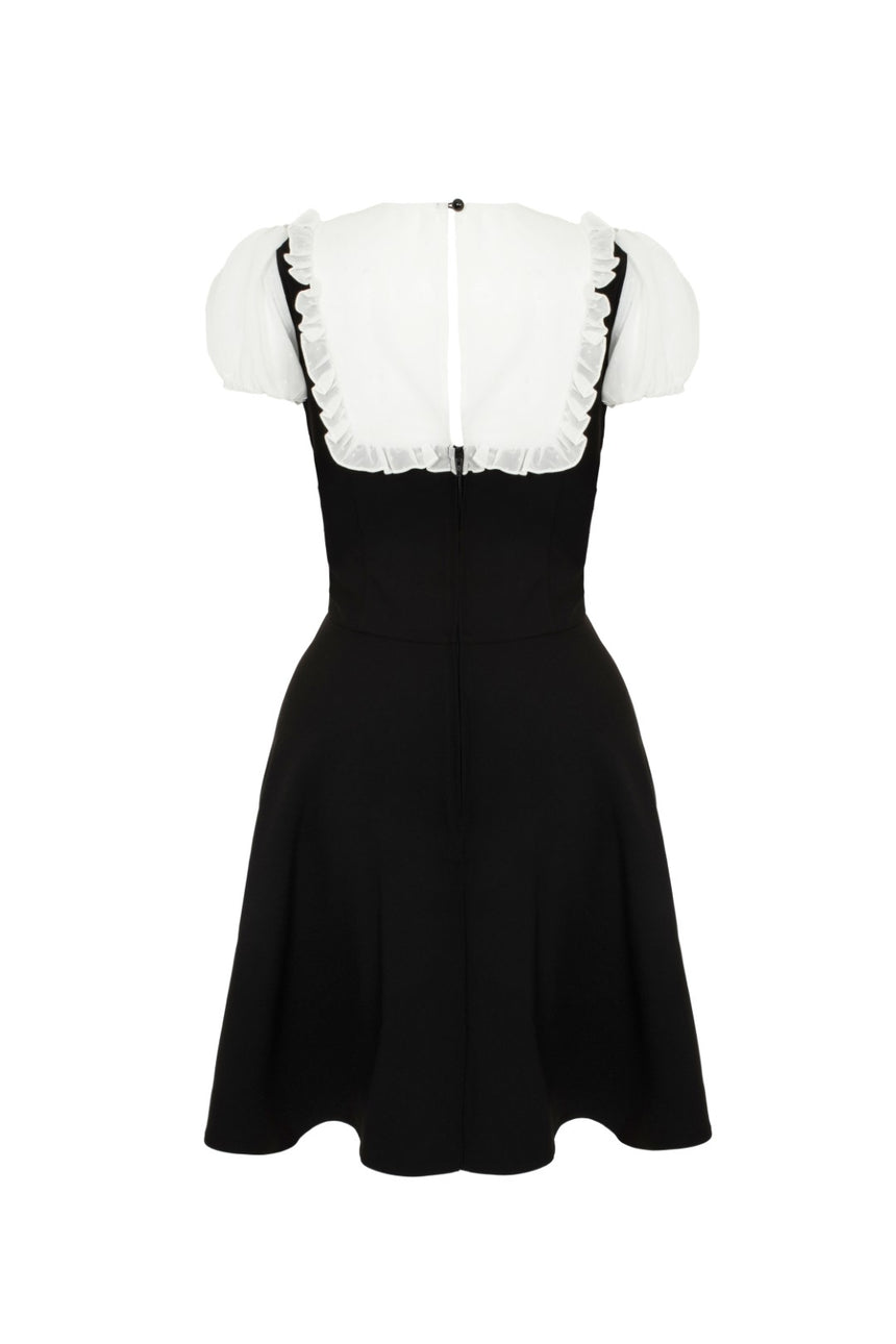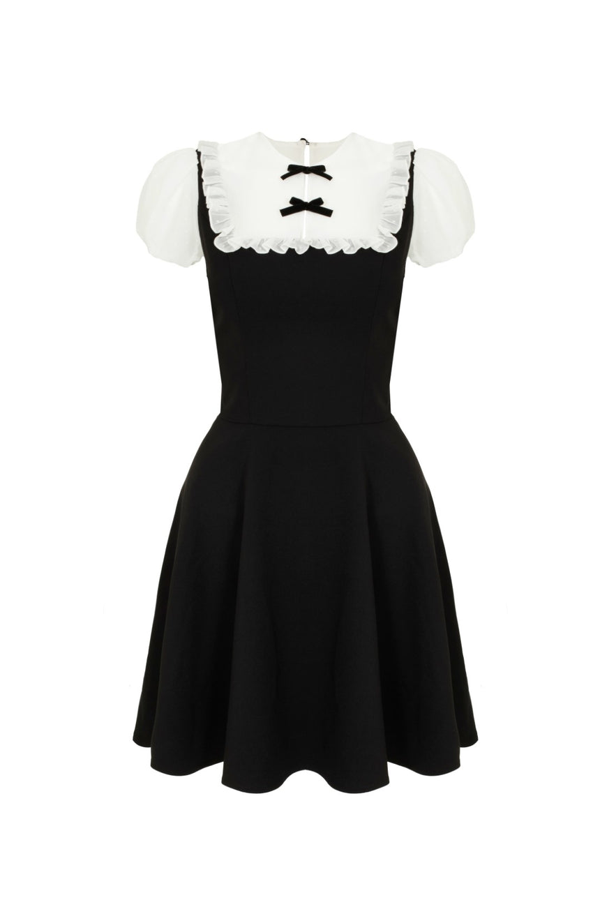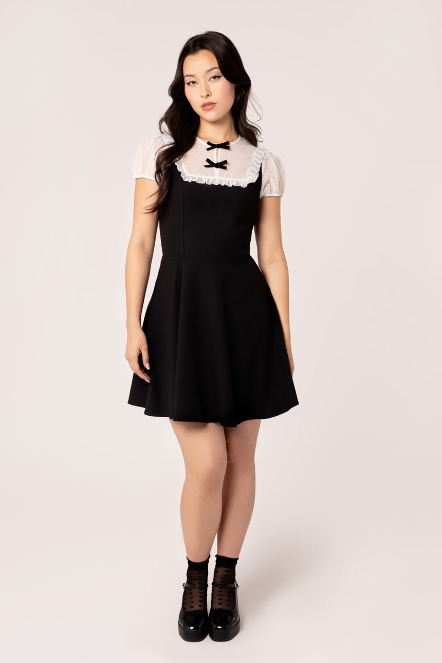 The little black dress just got an adorable new look with The Alice Dress. This cute mini dress features a contrasting white mesh panel on the chest, elevated with a white frill trim around the edges, and a central slit detail that’s decorated in dainty black bows. The short puff sleeves are made in the matching white mesh, finished with elasticated cuffs for added comfort. The fitted bodice flatters the waistline before flowing into a flared skirt, perfect for any occasion.