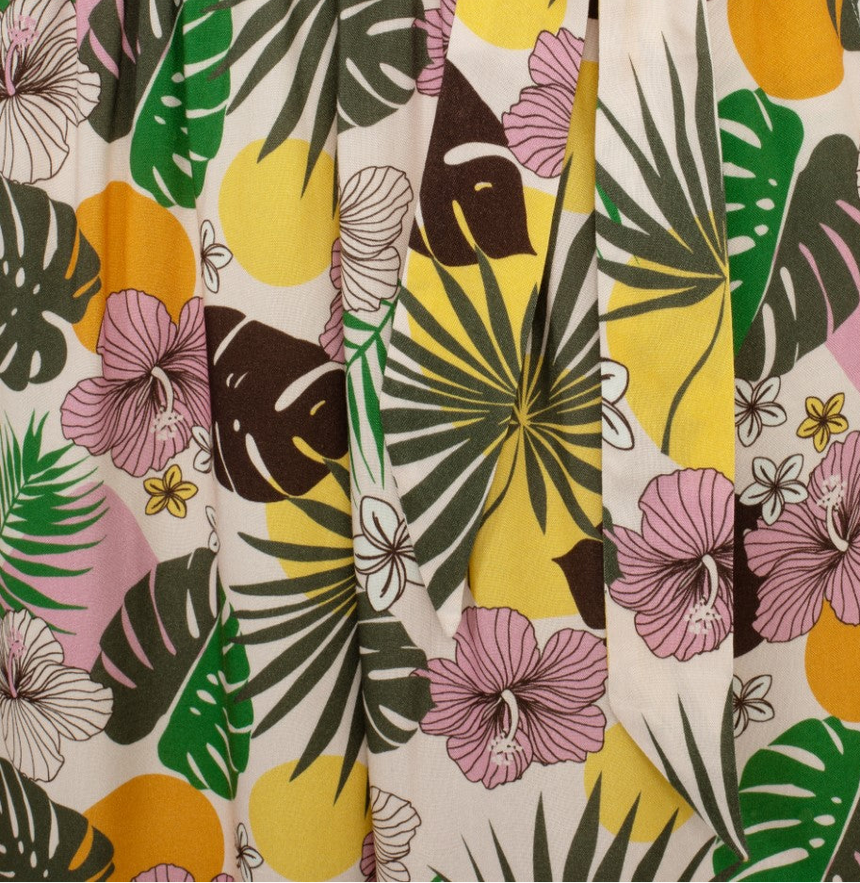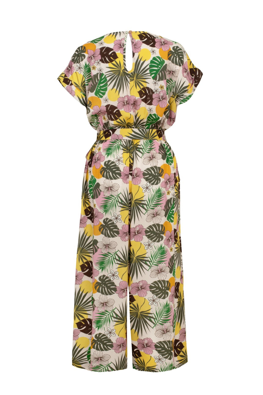 Take a trip to paradise with The Benita Jumpsuit. This cropped culottes jumpsuit is made with a light brown base, decorated with sunset tones and tropical foliage. The V-neck bodice is embellished with complementing brown wooden buttons, trailing down to the elasticated waist that comes with an additional waist tie. Details include a keyhole with a button at the centre back, mock rolled up cuffs at the sleeves, and pockets on the trousers for all your essentials.