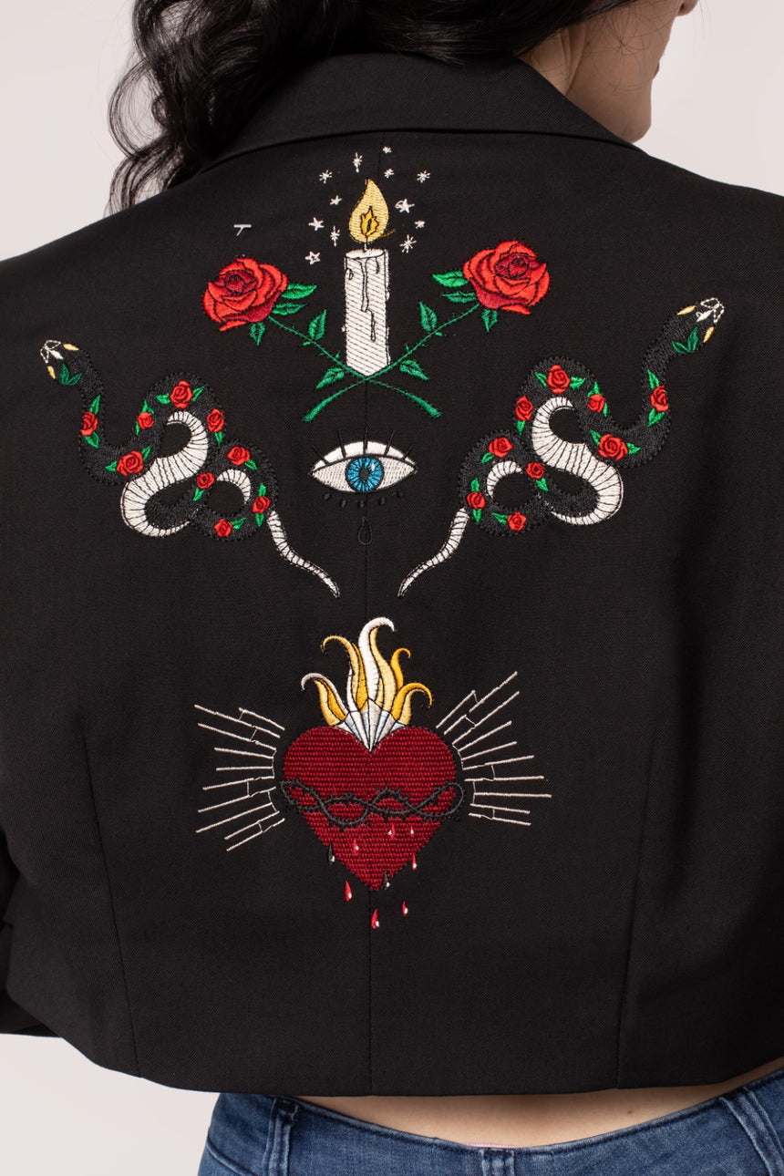 Turn heads with the Viva Maria cropped blazer. This bold black, cropped to the waist style is carved with a sharp V-neck pointed collar for added drama. Embellished with twin rose stem embroidery on the chest, and candle, snake, and heart embroidery on the centre back, the timeless iconography creates a bold statement in any look. The full length sleeves are adorned with 3 button details on the cuffs, while the blazer can be fastened with 3 large black buttons on the centre front. Leave undone for an effortlessly cool look.