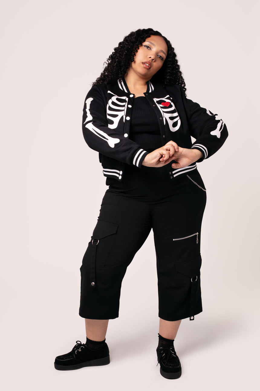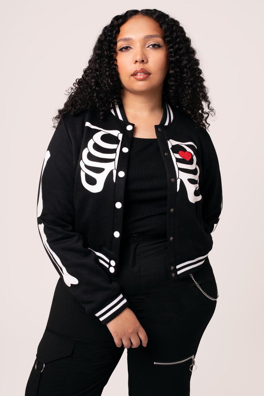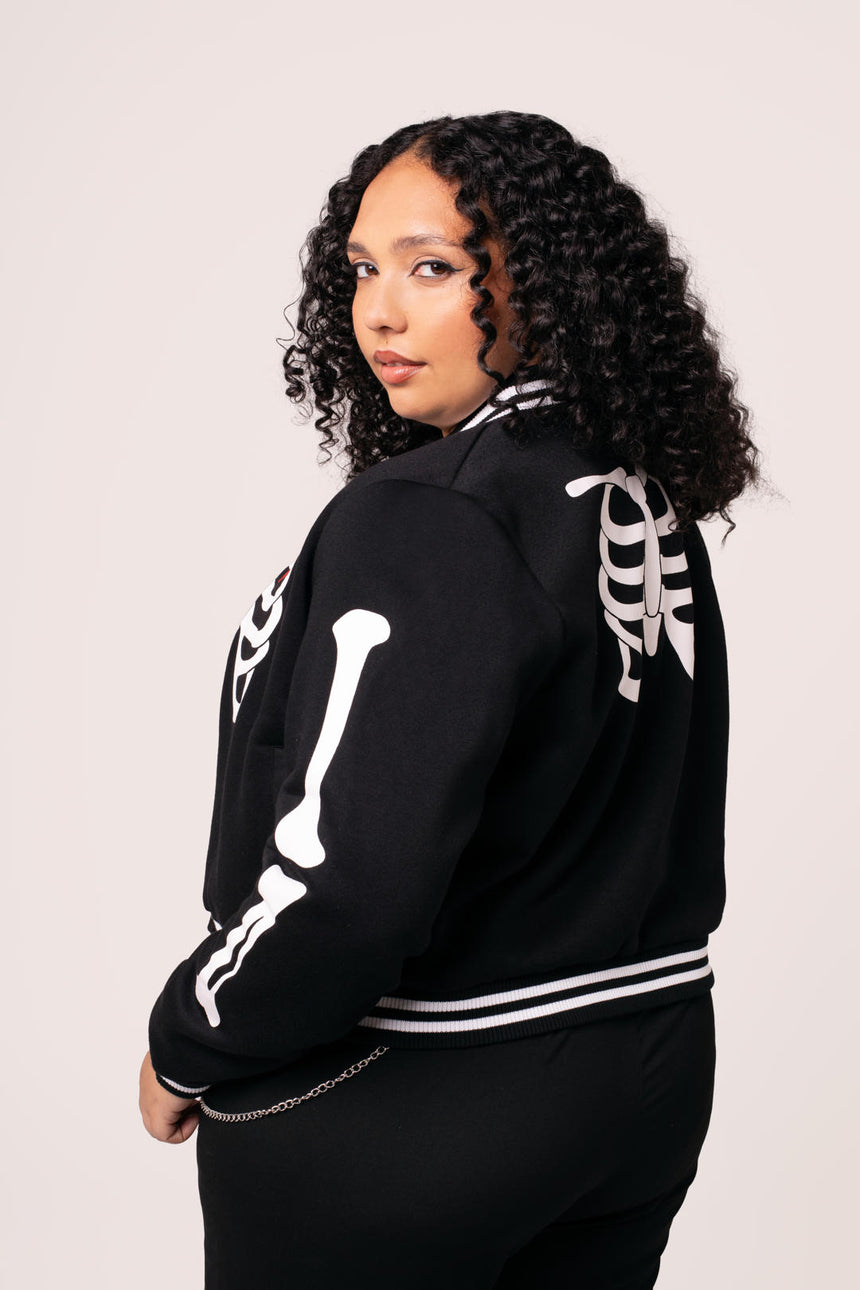 Halloween just got cuter with The Skeleton Girl Jacket. This bold black, cropped varsity-style jacket features a spooky ribcage motif print on the front and back, heart applique on the chest, with bones down the sleeves for a full, skeletal feel. Contrasting black and white ribbing finishes the neck, cuff, and sleeves. Pockets on the front keep all your treats safe. Finished with full black lining, The Skeleton Girl Jacket is the must have layer for adding a spooky touch to your style this season!