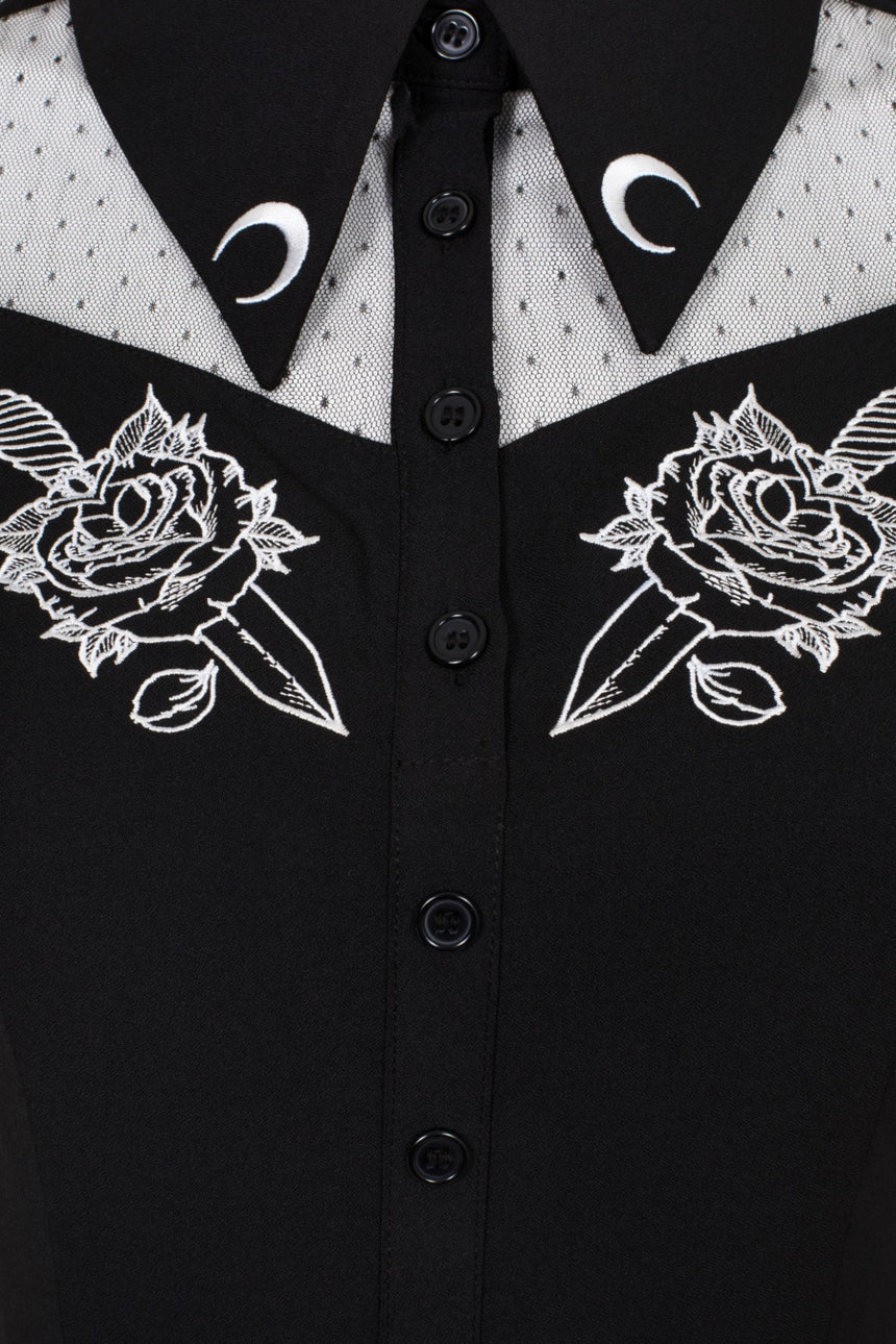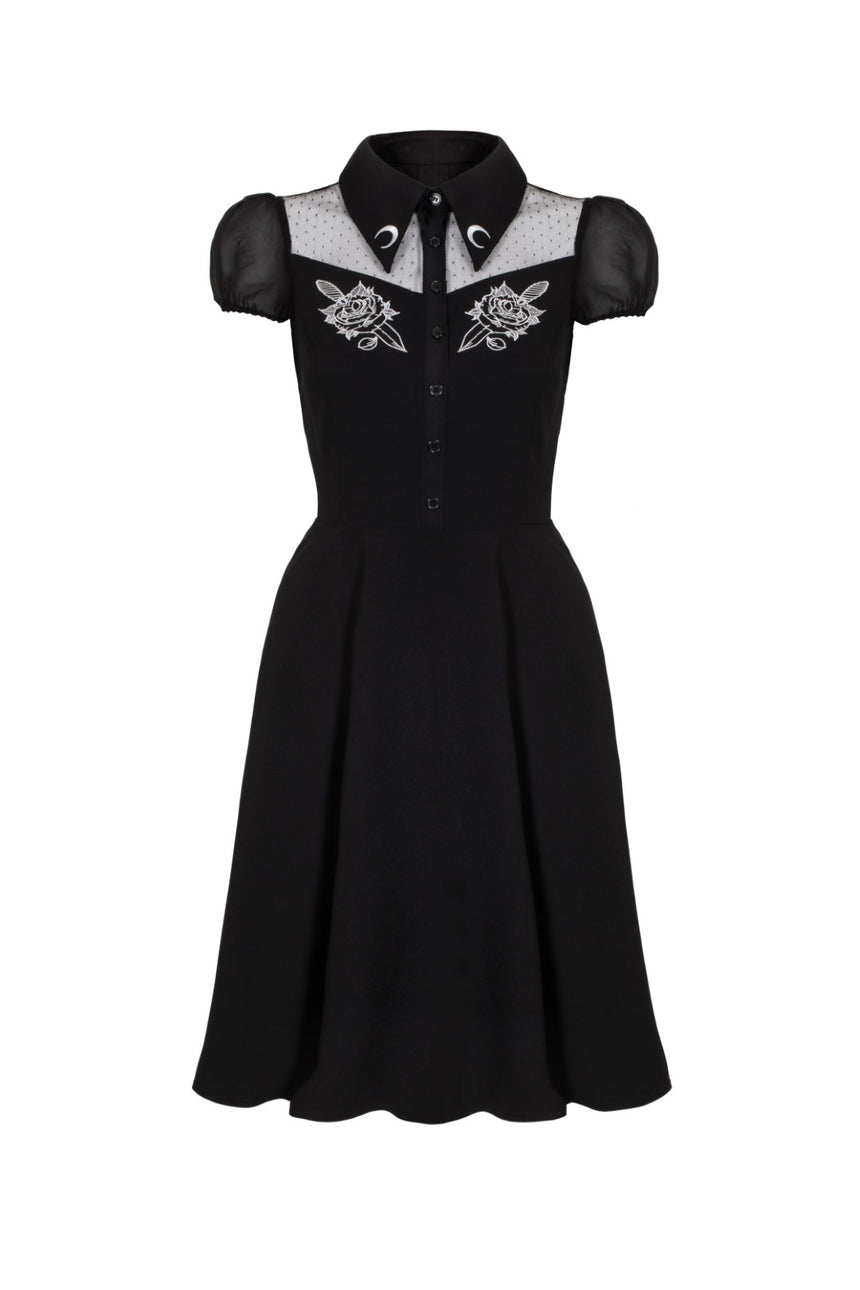 - Fitted bodice with cut-out detail on chest with black polka dot mesh