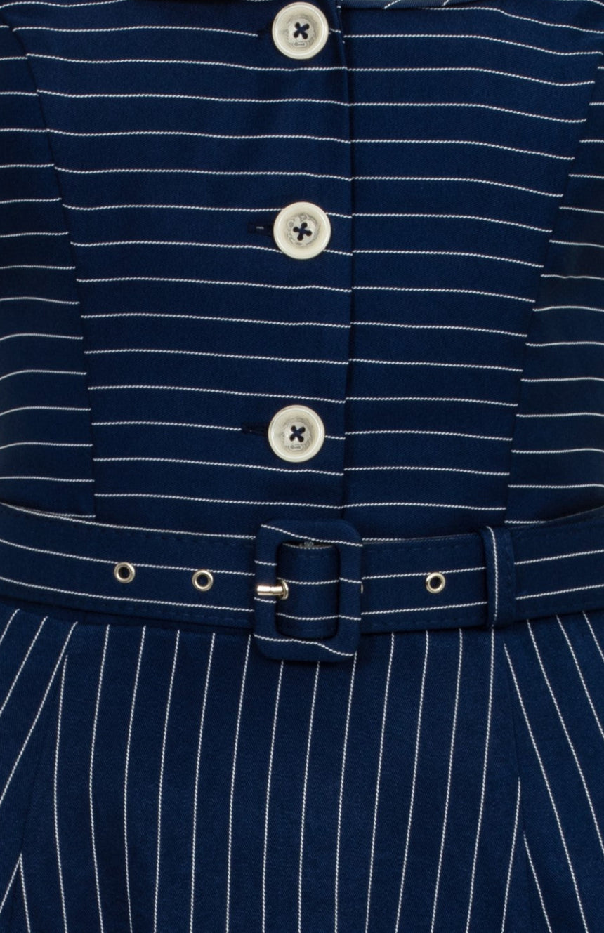 Put a pinstripe in your step with the Costello Knee Dress. This 40’s style dress features a navy body highlighted with white pinstripes, accentuated by the large curved white collar. The V-neckline is met with a centre front placket, covered in matching large white buttons. The bodice is fitted, before meeting with the wide matching belt, and flowing into a flared skirt boasting with twirl factor.