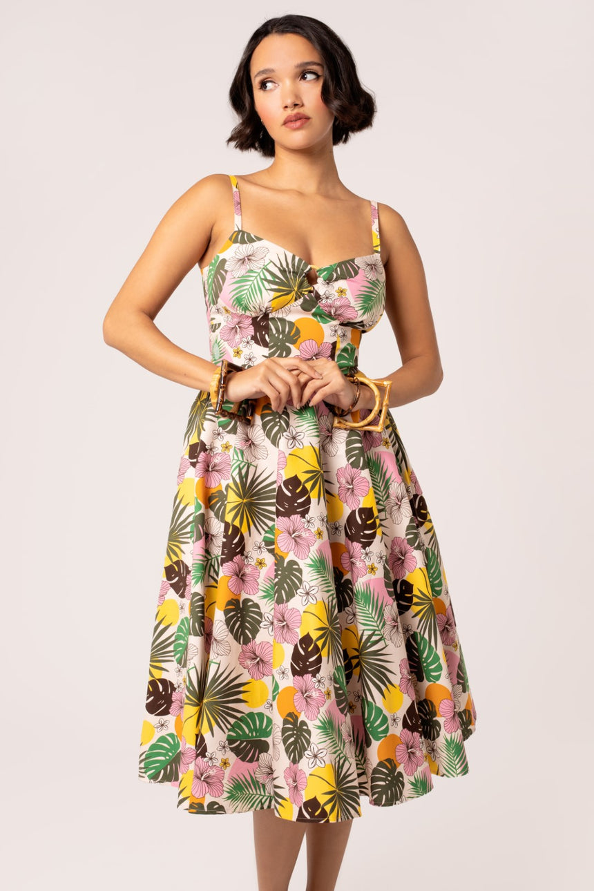 Take a trip to paradise with The Benita Dress. This 50’s style midi dress features a light brown cotton base, decorated with sunset tones and tropical foliage. The sweetheart neckline is complemented with gathering in the centre bust line, embellished with a bamboo ring detail. With adjustable spaghetti straps, pockets in the side seams, and a full circle skirt perfect for petticoats, The Benita Dress has everything you need for a fun season ahead.