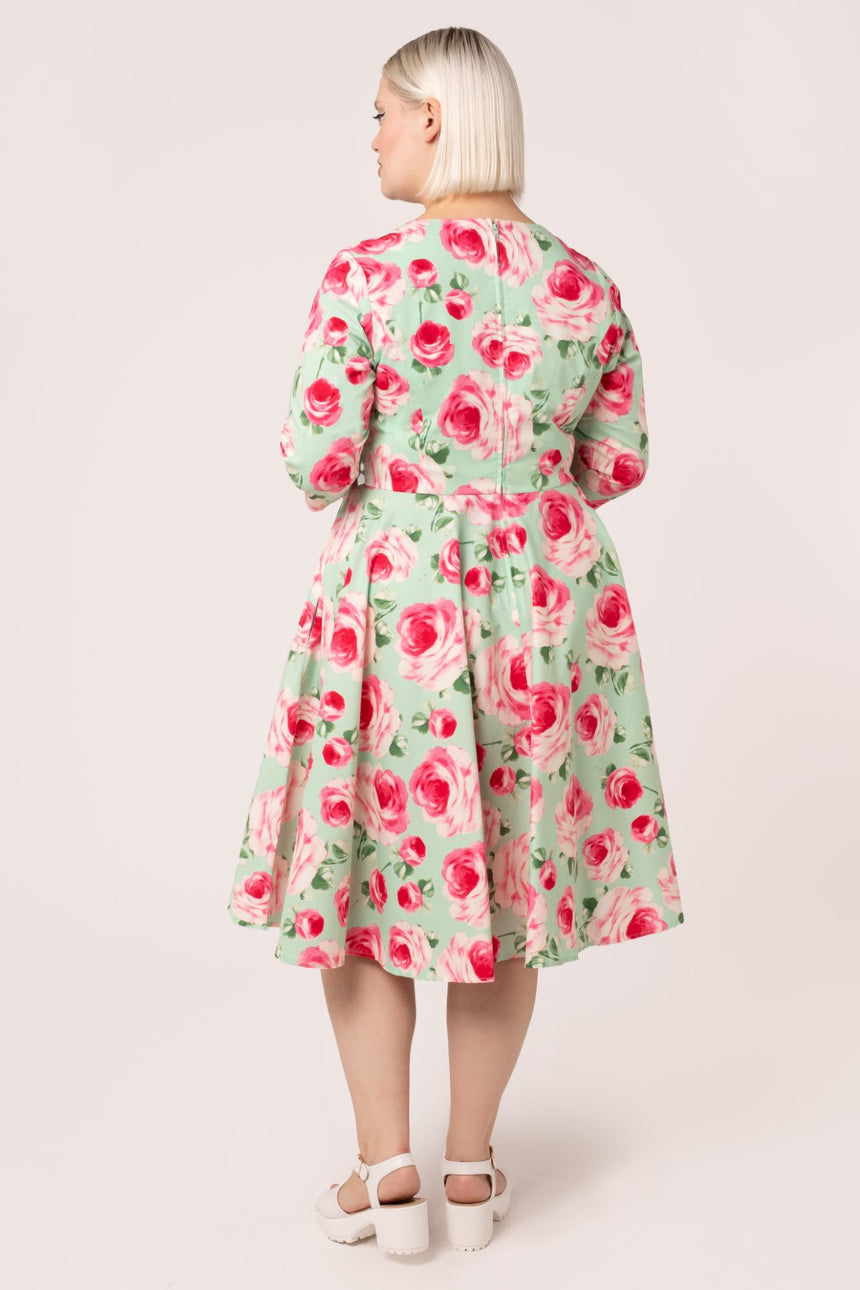 Stop and smell the roses in The Claire Dress. This 50’s style cotton dress features a mint green base, decorated with beautifully large pink roses all over. The sweetheart neckline is enhanced with gathering at the centre bust and bolero style panels at the shoulders, finished with elegant ¾ sleeves. Shaped with a fitted bodice that flares from the waist seam, the full circle skirt has pockets at the side seams. Style with one of our petticoats underneath for a fun, vintage feel.