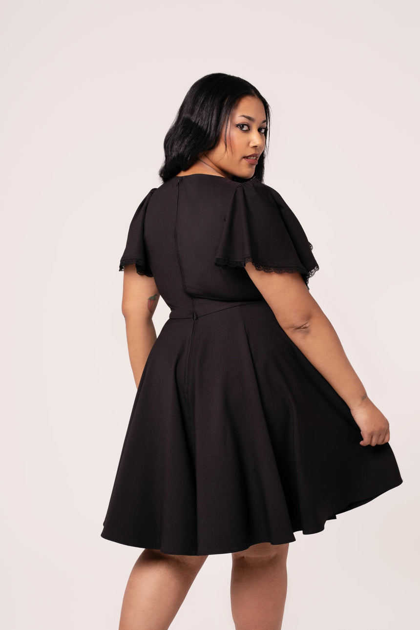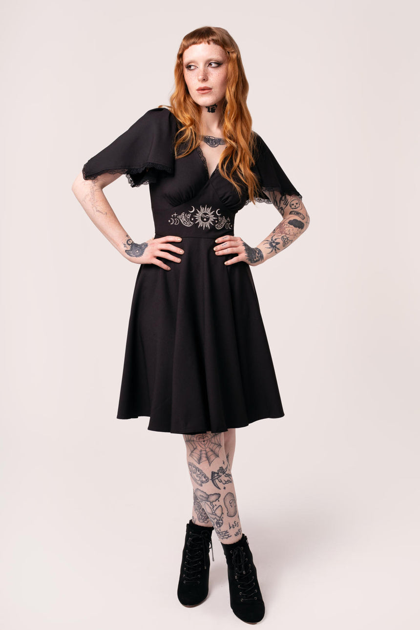 Add some mystery to the everyday with The Danica Dress. This midi dress is made from a bold black base, decorated with celestial, tarot-themed white embroidery along the waist and neckline..The V-neckline skims the chest, gathering into the fitted underbust waist panel. The skirt flares from the waist for added volume with a gathered panel at the hem for even more movement. Elegant draped sleeves are finished with lace trim, making The Danica Dress the most mystical addition to your wardrobe.