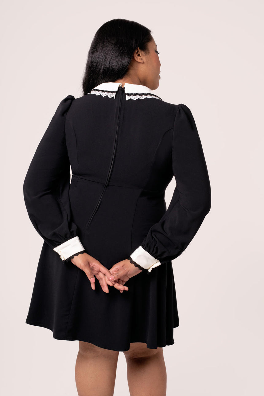 Channel your inner Wednesday with The Anastasia Dress. This bold black mini dress is enhanced with an oversized, pointed collar with decorative lace trim. The chest is accentuated with contrasting white button details. Full-length puff sleeves gather into the perfect button fastening cuffs to match the collar. The fitted bodice shapes until the waistline, before flowing into a flared skirt that’s perfect for dancing the night away.
