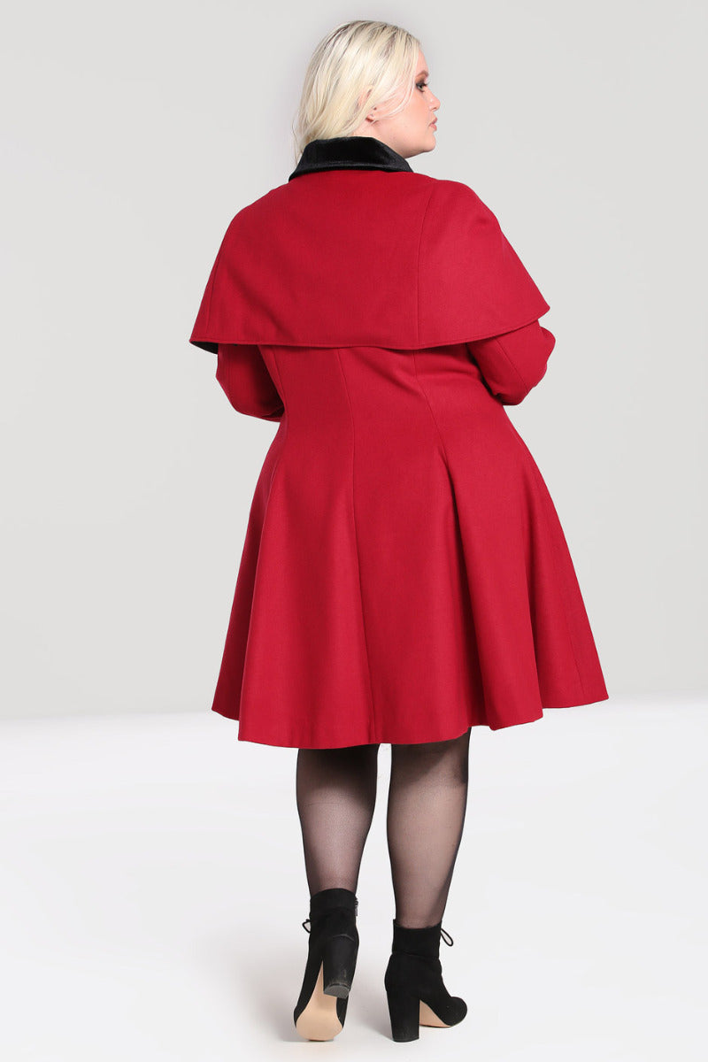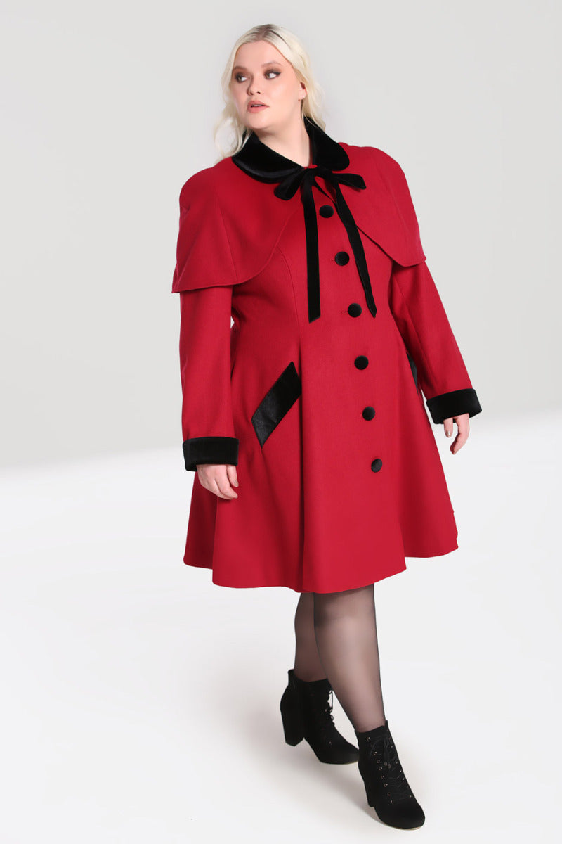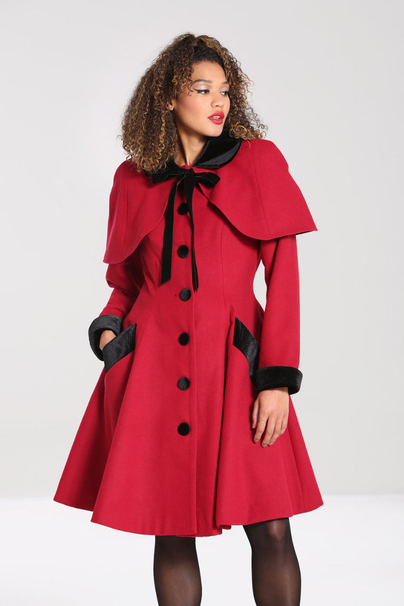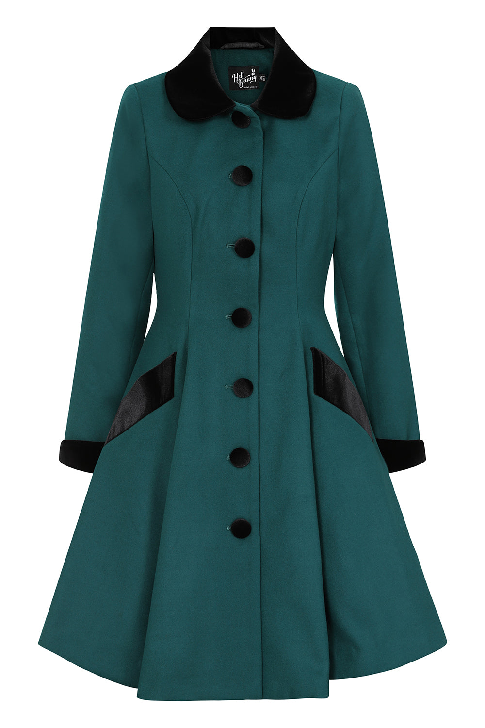 - Contrasting black velvet peter pan collar and sleeve cuffs