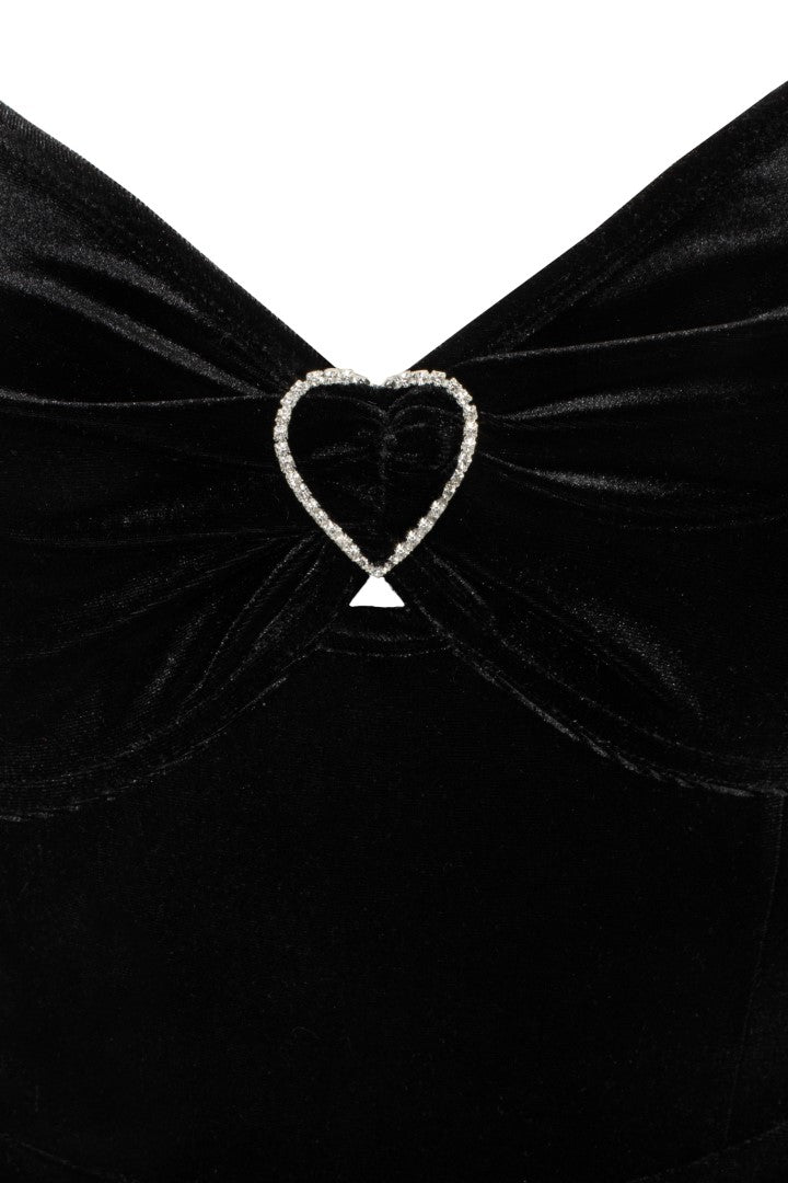 The little black dress to solve getting ready? You mean The Vendome Dress. This solid black, stretch velvet dress features a flirty sweetheart neckline, decorated with a sparkly silver heart detail on the chest. The narrow shoulder straps can be adjusted for personal comfort. The fitted bodice hugs the body before flaring from the waist for volume and twirl factor.