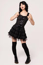 Introducing the newest colourway to one of our most iconic designs, The Harley Dress! This punk style, classic pinstripe dress features corset-style lace-up detailing at the front, with a 3 tiered skirt for drama. Black lace trim decorates the straps, neckline, and skirt layers. The wide shoulder straps can be adjusted with buttons at the back, and a shirred elastic panel in the back adds extra stretch and comfort. The Harley Dress will make you feel like a punk princess!