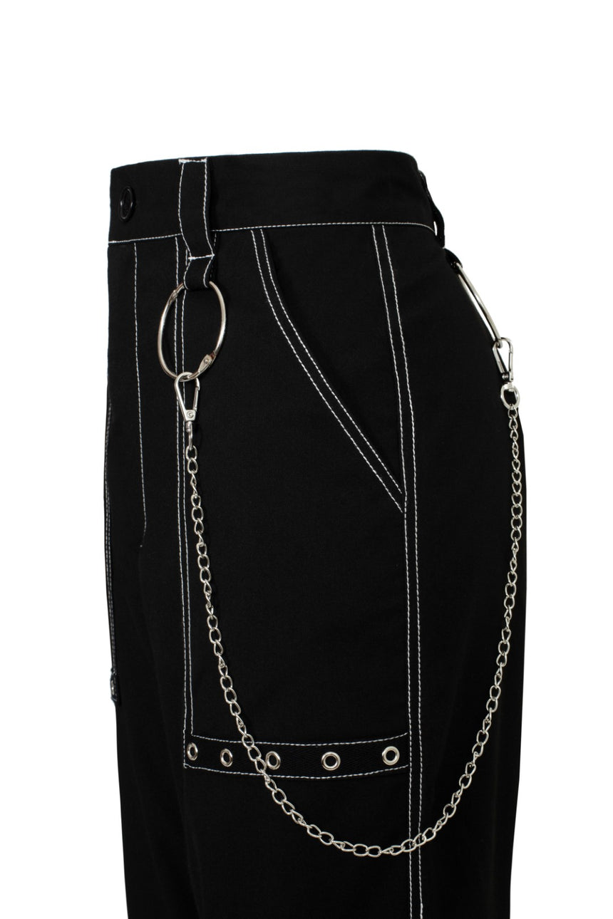 - Pockets in front with white contrast embroidery and silver eyelets along bottom of pockets